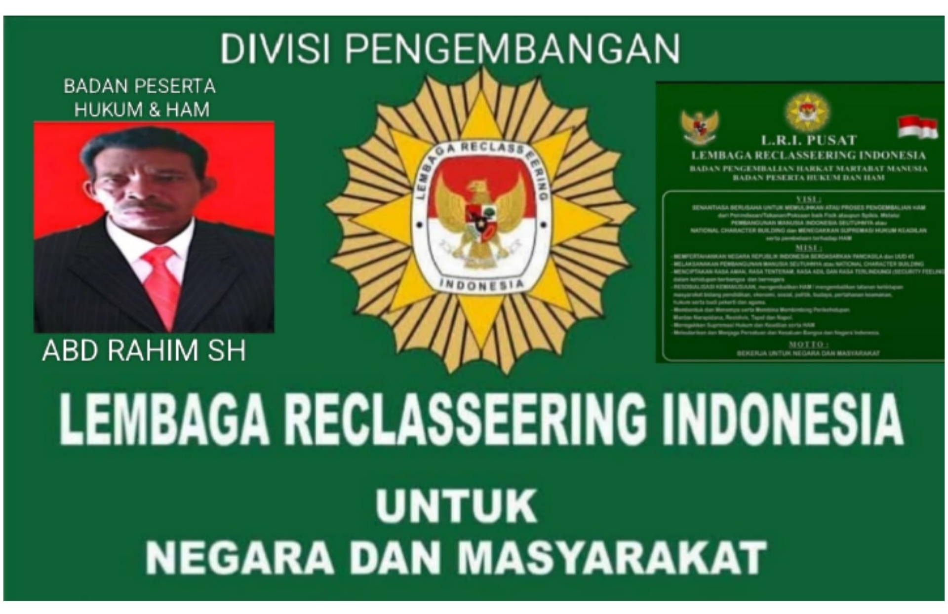 JAKARTA,VN— Divisi Pengembangan Badan Peserta Hukum dan Hak Asasi Manusia (HAM) Lembaga Reclassering Indonesia (LRI), ABD Rahim, S.H., mewakili Ketua Umum LRI Azhar Soeparman, S.A.Md., AP.J., menegaskan kembali eksistensi, legalitas, serta struktur kepengurusan LRI Pusat sebagai organisasi yang sah dan aktif menjalankan fungsi kemasyarakatan dan pemulihan HAM di Indonesia.