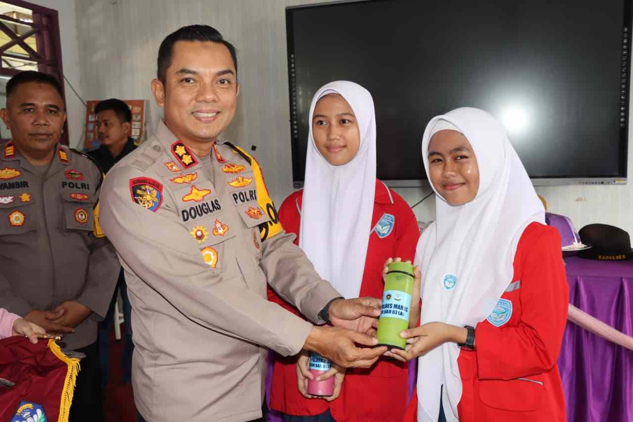 ​Dalam kegiatan tersebut, Kapolres menyerahkan bantuan berupa tumbler (botol minum) dan set sendok makan kepada para siswa penerima manfaat.